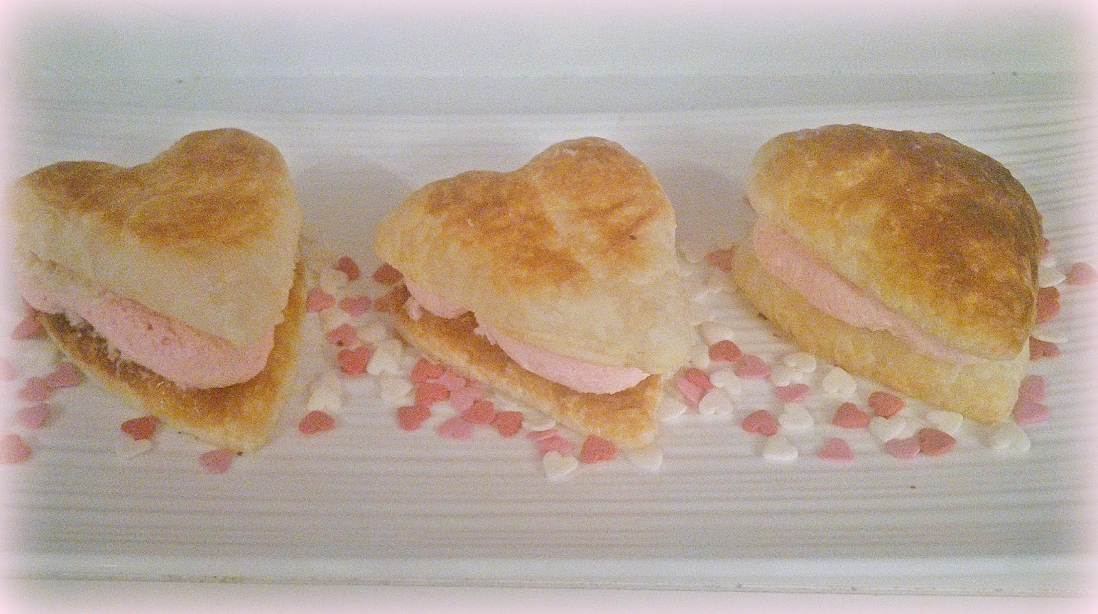 Abrimos cada corazón de hojaldre por el medio y con la ayuda de una manga pastelera cubrimos con nata de fresa y cubrimos con la otra mitad del corazón. Y listo!! A enamorar con este postre!!